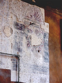 Sulla stessa facciata ma , spostato verso l’angolo, all’altezza del 2° piano é presente già da vari anni , in seguito a caduta di intonaci, una porzione di affresco nella quale si intravedono figure zoomorfe monocrome su fondo in tinta unita sovrastanti una fascia dipinta a bassorilievo.