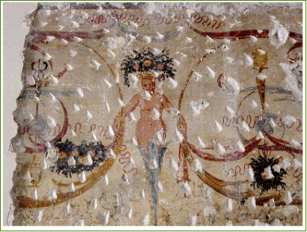 Interessante da notare che sulla superficie affrescata, specialmente nelle fasce dipinte a finto marmo, sono presenti graffiti con date intorno al 1600 e firme di persone anche con cognomi stranieri.
